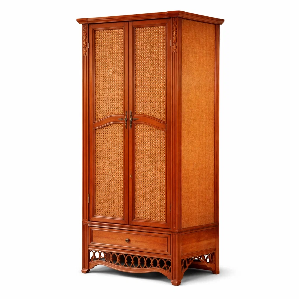 Der Kleiderschrank besteht aus Massivholz mit Rattangeflecht an den Türen. Er ist in der Farbe Braun gehalten und hat folgende Maße: Höhe 200 cm, Breite 80 cm und Tiefe 50 cm. Die Metallscharniere unterstreichen die klassische Gestaltung. Der Schrank verfügt über eine Schublade und Schwingtüren.