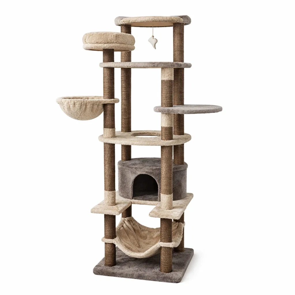Der Baum verfügt über 4 Etagen mit einer Vielzahl von Funktionen: 6 Ruheplattformen, hängendes Spielzeug und Kratzmöglichkeiten.